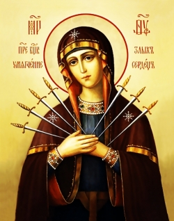 "თვით შენს სულშიც გაივლის მახვილი". წმინდა წერილში რიცხვი 7 აღნიშნავს რაიმეს სისრულეს. ამ შემთხვევაში კი სისრულეს იმ მწუხარებისა, "სევდისა და გულისტკივილისა", რომელიც ყოვლადწმინდა ღვთისმშობელმა ამქვეყნიური ცხოვრების დროს გადაიტანა.ხატზე გამოსახულია შვიდი ისრით განგმირული ღვთისმშობელი. ამ ხატის პირველ სასწაულზე შემდეგი თქმულებაა შემორჩენილი: ერთ ხეიბარ გლეხს, რომელსაც მრავალი წლის მანძილზე ტანჯავდა სისუსტე და მტკივანი ფეხი, ესიზმრა, რომ თუკი იოანე ღვთისმეტყველის ტაძრის წინაშე ილოცებდა, განიკურნებდა. გლეხი ორჯერ მივიდა ტაძარში, სიზმარს მოჰყვა და ითხოვა, სამრეკლოზე აეშვათ. არ დაუჯერეს და თხოვნაზე უარი უთხრეს. მესამედ, როგორც იქნა, შეიბრალეს და სამრეკლოზე აუშვეს. მან მაშინვე მიაგნო სიზმრად ნანახ წმინდა ხატს. იგი კიბეზე ფიცრის ნაცვლად ჩაესვათ და ჭუჭყითა და ჩიტების ნაფიფქით იყო დაფარული. ხატი გაასუფთავეს. გლეხმა ხატთან პარაკლისის გადახდა ითხოვა და მიიღო კიდეც კურნება.