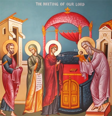 ტროპარი: გიხაროდენ, მიმადლებულო ღვთისმშობელო ქალწულო, რამეთუ შენგან განხორციელდა მხსნელი სოფლისა, ქრისტე ღმერთი ჩვენი, იხარებდ შენცა, მოხუცებულო მართალო სვიმეონ, რამეთუ მიიქუ მკლავთა შენთა განმათავისუფლებელი სულთა ჩვენთა, რომელი მოგვანიჭებს ჩვენ დიდსა წყალობასა.